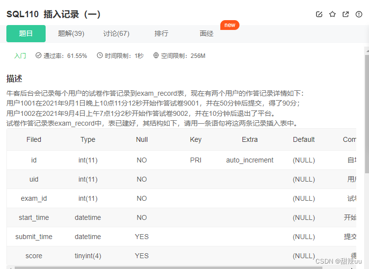 Filed Type Null Key Extra Default Comment id int(11) NO PRI auto_increment (NULL) 自增ID uid int(11) NO (NULL) 用户ID exam_id int(11) NO (NULL) 试卷ID start_time datetime NO (NULL) 开始时间 submit_time datetime YES (NULL) 提交时间 score tinyint(4) YES (NULL) 得分 该题最后会通过执行SELECT uid, exam_id, start_time, submit_time, score FROM exam_record;来对比结果