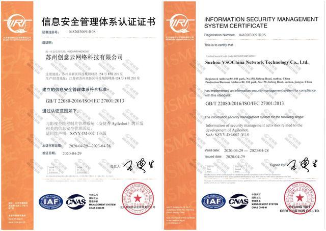 此次北京泰瑞特认证有限责任公司从物理安全、网络安全、设备安全、信息系统安全、人员安全管理等多个方面,对创意云及其自主研发的影视全流程制片管理系统(安捷秀AgileShot)进行了严谨专业、全面系统的认证。