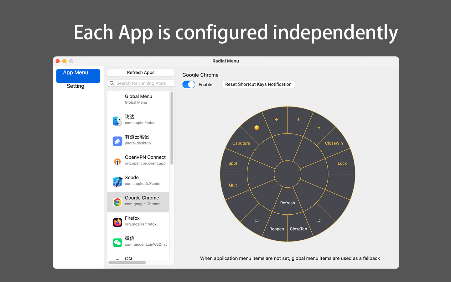 软件支持为每个应用独立指定快捷菜单,并根据鼠标触发位置自动识别应该现实的菜单上下文,生产力使用者建议。