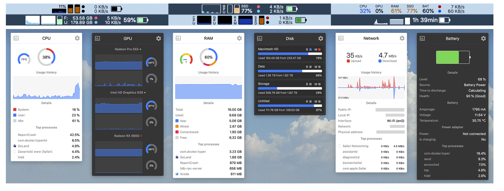 新的Apple芯片的Mac热量控制上好了很多,基本不怎么发热了。 目前主要使用他的网络监控。 有时候进行一些下载动作,不会显示网速和时间,比如IDE,命令行,更新插件,依赖库。这时候通过它的网络检测就是一个很好的指示,