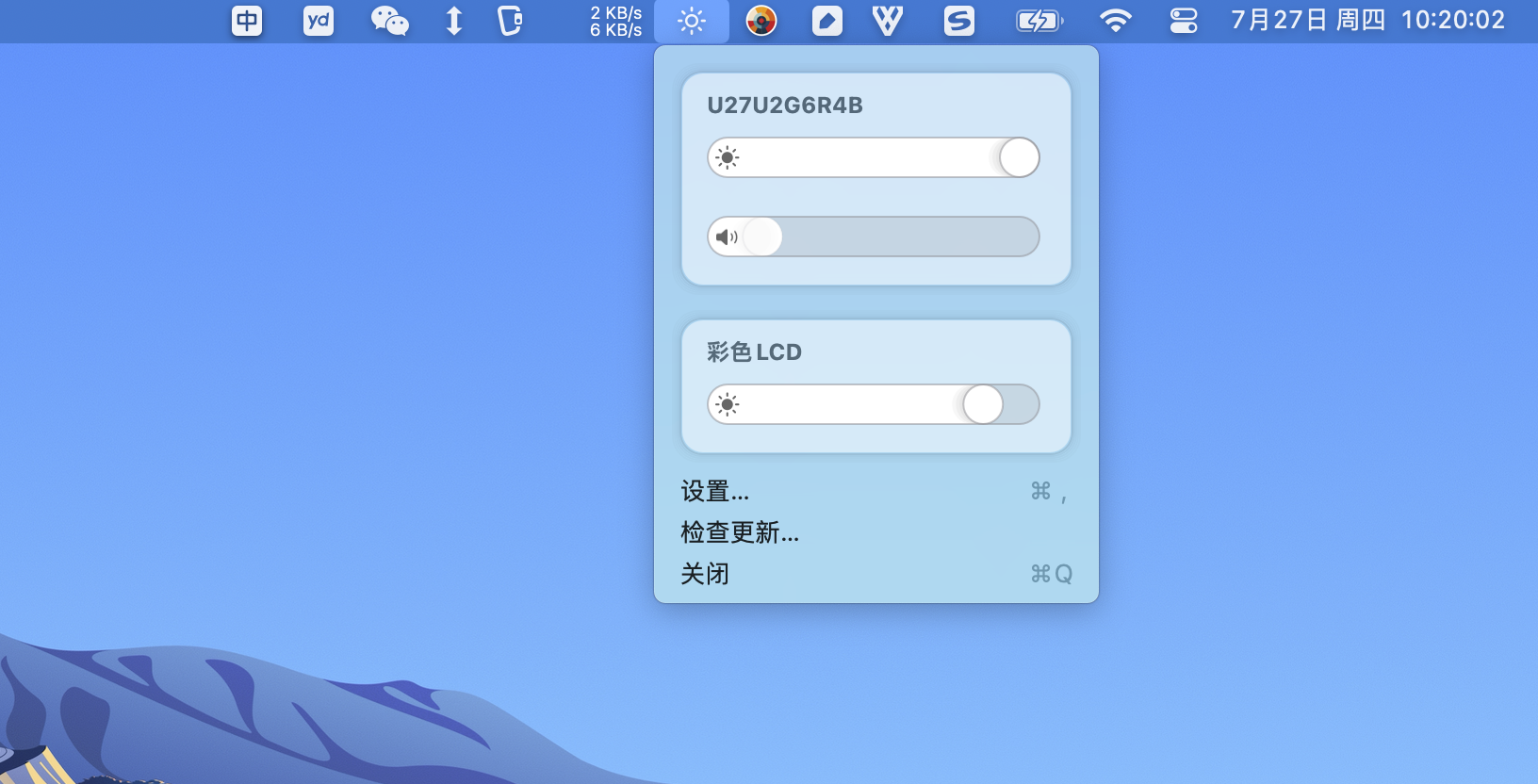有了这个软件,可以通过软件方式直接在系统内控制外接显示器的亮度。 十分方便。同时它还提供了与内置显示器亮度同步的功能, 内置显示器有亮度传感器,自动亮度变化后,外置显示器可以同步。