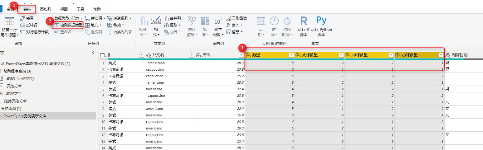 Power BI还提供了一个自动检测数据类型的功能,用于应对多个列数据类型都需要变更时。