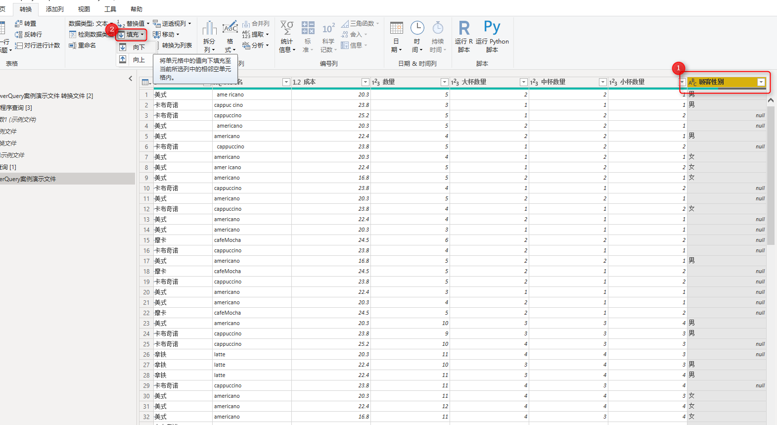 选择“列”--点击“转换”--点击“填充”(“向下--利用null值最近上面的值填充”,“向上--利用null值最近下面的值填充”)