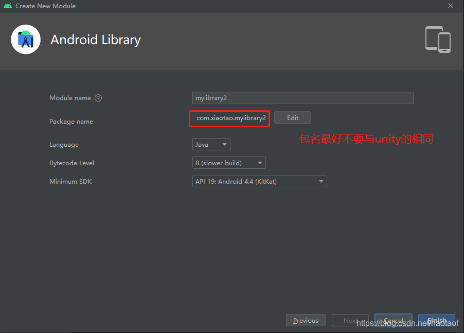 4.编辑自己的项目库名称和包名(注意:包名仅为此sdk使用,最好不要与unity项目的包名相同,可能unity打包时会冲突)