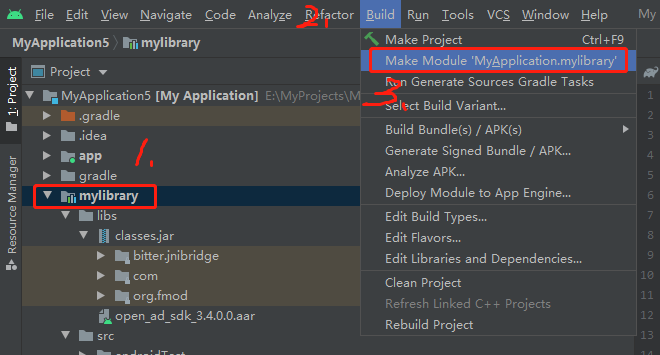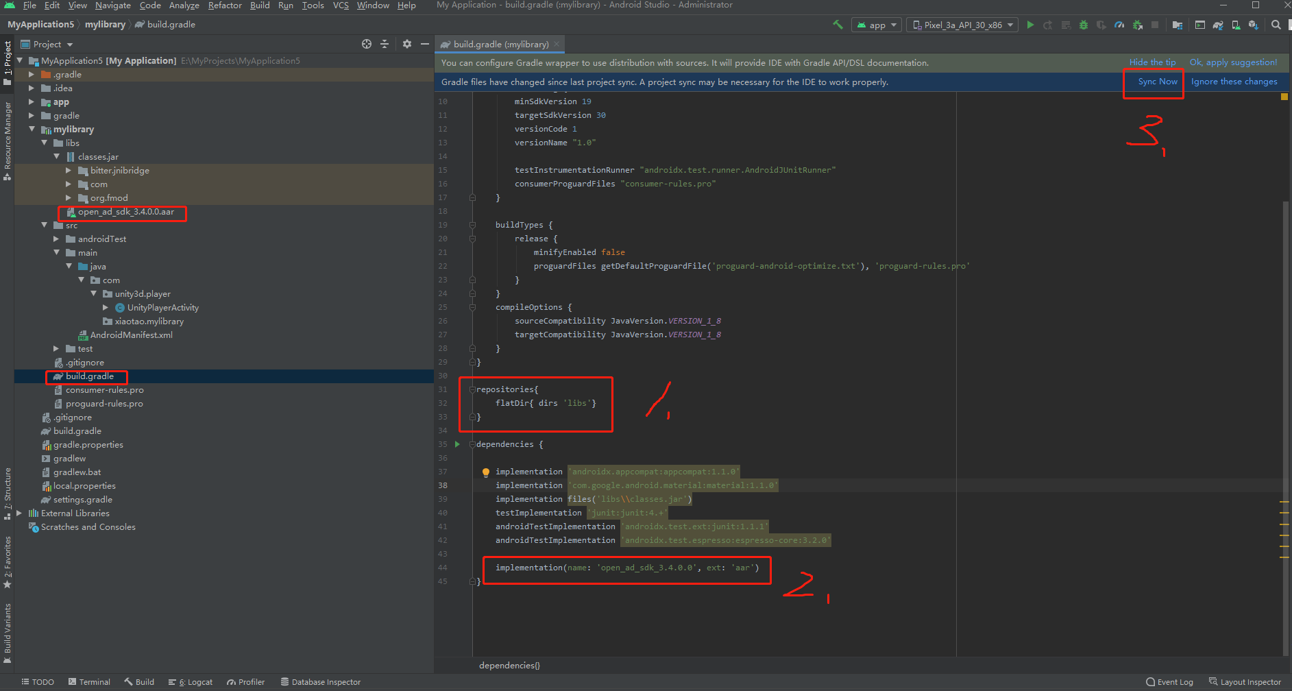 6.将sdk的jar包和arr包放到上图1(libs)目录下,如果需要回调unity的话可以把unity的class.jar包也放到里边