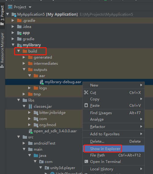 6.2 回调unity的话需要将UnityPlayerActivity.java也放入工程,并且java脚本要继承UnityPlayerActivity,所在目录如下图