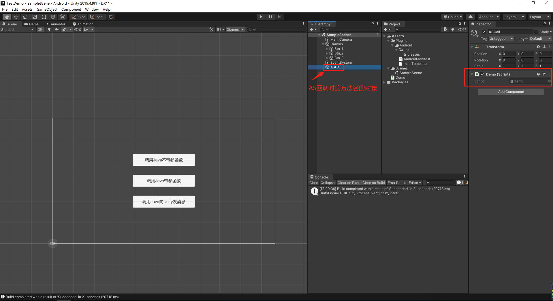 import static android.content.ContentValues.TAG;public class ASCallUnity extends UnityPlayerActivity {@Overrideprotected void onCreate(Bundle savedInstanceState) {super.onCreate(savedInstanceState);}private static ASCallUnity m_instance;public static ASCallUnity Instance(){if (null == m_instance)m_instance = new ASCallUnity();return m_instance;}//示例代码,java回调unity,其实和unity中的发送消息给对象是一样的public void SendMsg(){//第一个参数为unity中的对象名称//第二个参数为unity对象脚本中的方法//第三个参数为unity对象脚本中的方法中需要传的参数,这个参数看方法,包括参数类型,有的话就传,没有的话可以不穿//UnityPlayer.UnitySendMessage("gameObjectName", "_funcStr", "args");Log.d(TAG, "CallUnity: 向Unity发送消息");UnityPlayer.UnitySendMessage("ASCall", "AsCallTest", "ASCallUnity");}