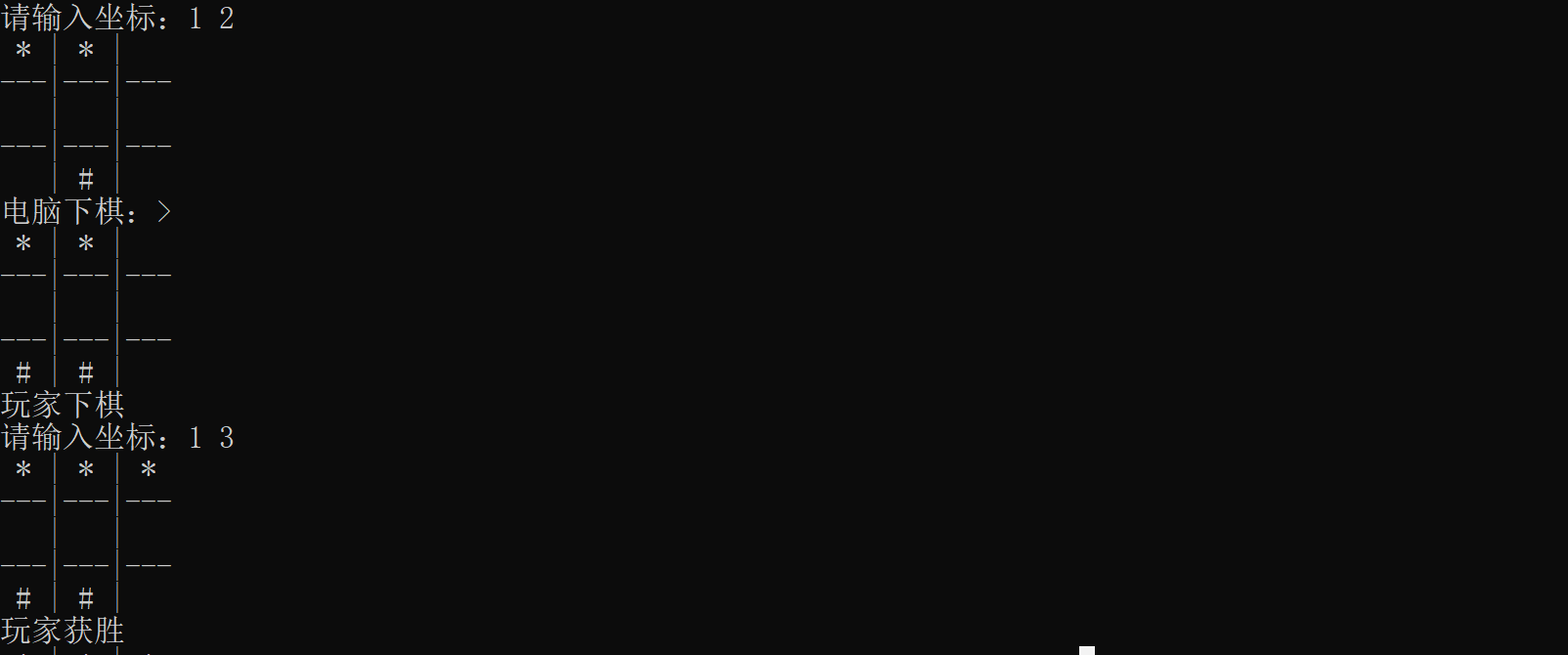 while (1)//玩家和电脑轮流下棋,直到一方胜利{ //玩家下棋player_move(board, ROW, COL);//打印棋盘DisplayBoard(board, ROW, COL);ret = is_win(board, ROW, COL);if (ret != 'C'){break;}//电脑下棋computer_move(board, ROW, COL);//打印棋盘DisplayBoard(board, ROW, COL);ret = is_win(board, ROW, COL);if (ret != 'C'){break;}}if (ret == '*'){printf("玩家获胜\n");}else if (ret == '#'){printf("电脑获胜\n");}else // (ret == 'Q'){printf("平局\n");}DisplayBoard(board, ROW, COL);