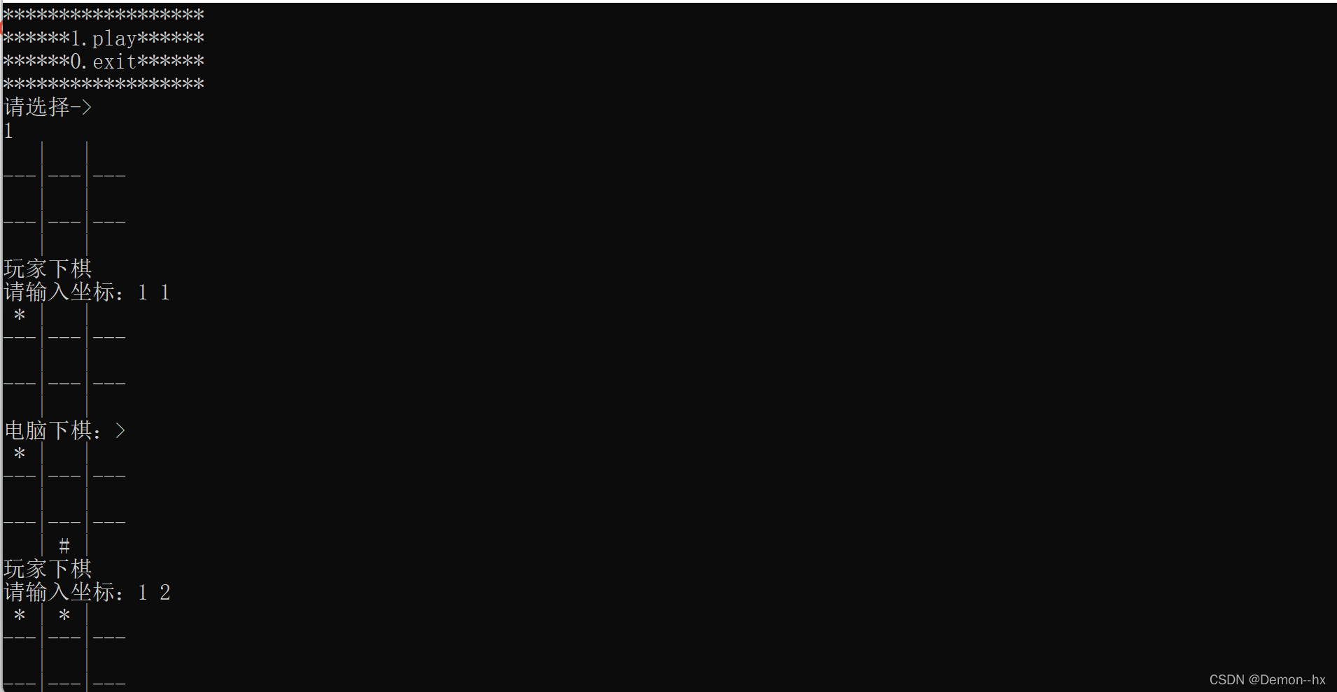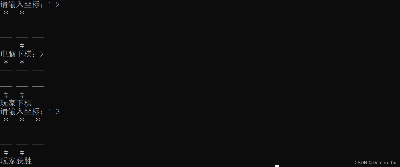 {int x = 0;int y = 0;printf("电脑下棋:>\n");while (1){x = rand() % 3;y = rand() % 3;if (board[x][y] == ' '){board[x][y] = '#';break;}}