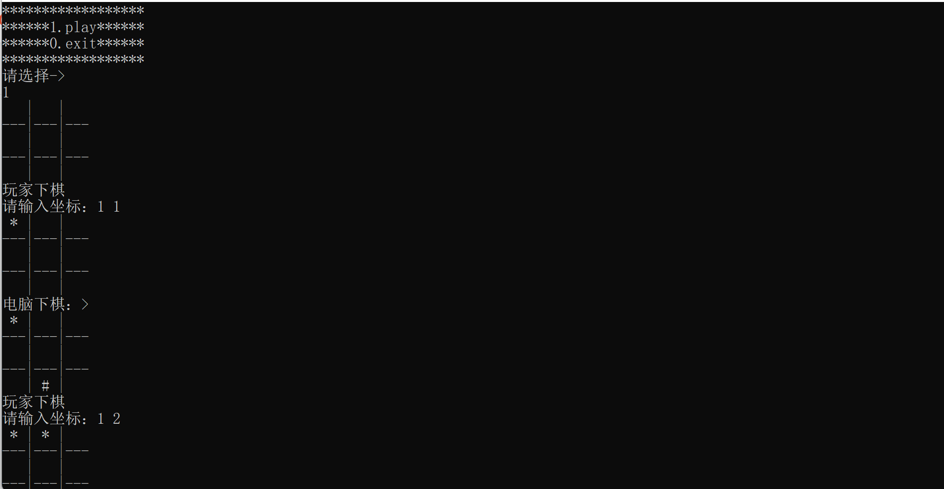 //继续返回'C'while (1){ //玩家下棋player_move(board, ROW, COL);//打印棋盘DisplayBoard(board, ROW, COL);ret = is_win(board, ROW, COL);if (ret != 'C'){break;}//电脑下棋computer_move(board, ROW, COL);//打印棋盘DisplayBoard(board, ROW, COL);ret = is_win(board, ROW, COL);if (ret != 'C'){break;}}if (ret == '*'){printf("玩家获胜\n");}else if (ret == '#'){printf("电脑获胜\n");}else // (ret == 'Q'){printf("平局\n");}DisplayBoard(board, ROW, COL);