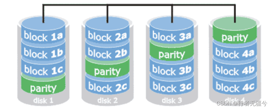 将数据按照RAID0的形式,分成多份同时写入多块磁盘,但是还会另外再留出一块磁盘用于写「奇偶校验码」。例如总共有N块磁盘,那么就会让其中额度N-1块用来并发的写数据,第N块磁盘用记录校验码数据。一旦某一块磁盘坏掉了,就可以利用其它的N-1块磁盘去恢复数据。