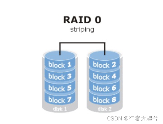 Raid 0 技术是把多块(至少两块)物理硬盘通过工具绑在一起,组成一个大的虚拟存储设备,并将数据分成几块分别依次写入到各个物理硬盘中。如图1所示,数据被分成多段分别写入到不同的硬盘中,即数据分别保存到disk1和disk2中,最终实现提升读取、写入的速度。