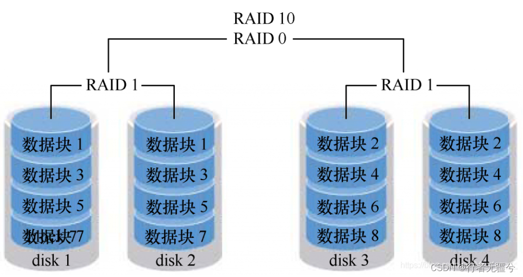 Raid10是Raid1和Raid0的组合体,如图所示,Raid10技术至少需要4块硬盘来组建,其中先分别两两制成Raid1磁盘阵列,以保证数据的安全性。然后再对两个Raid1磁盘按阵列实施Raid0技术,进一步提高硬盘设备的读写速度。这样从理论上讲,只要坏的不是同一组中的所有磁盘,那么最多可以损坏50%的硬盘设备而不丢失数据。由于Raid10技术击继承了Raid0的高速写速度和Raid1的数据安全性,在不考虑成本的情况下Raid10的性能都超过了Raid5,因此当前成为广泛使用的一种存储技术。