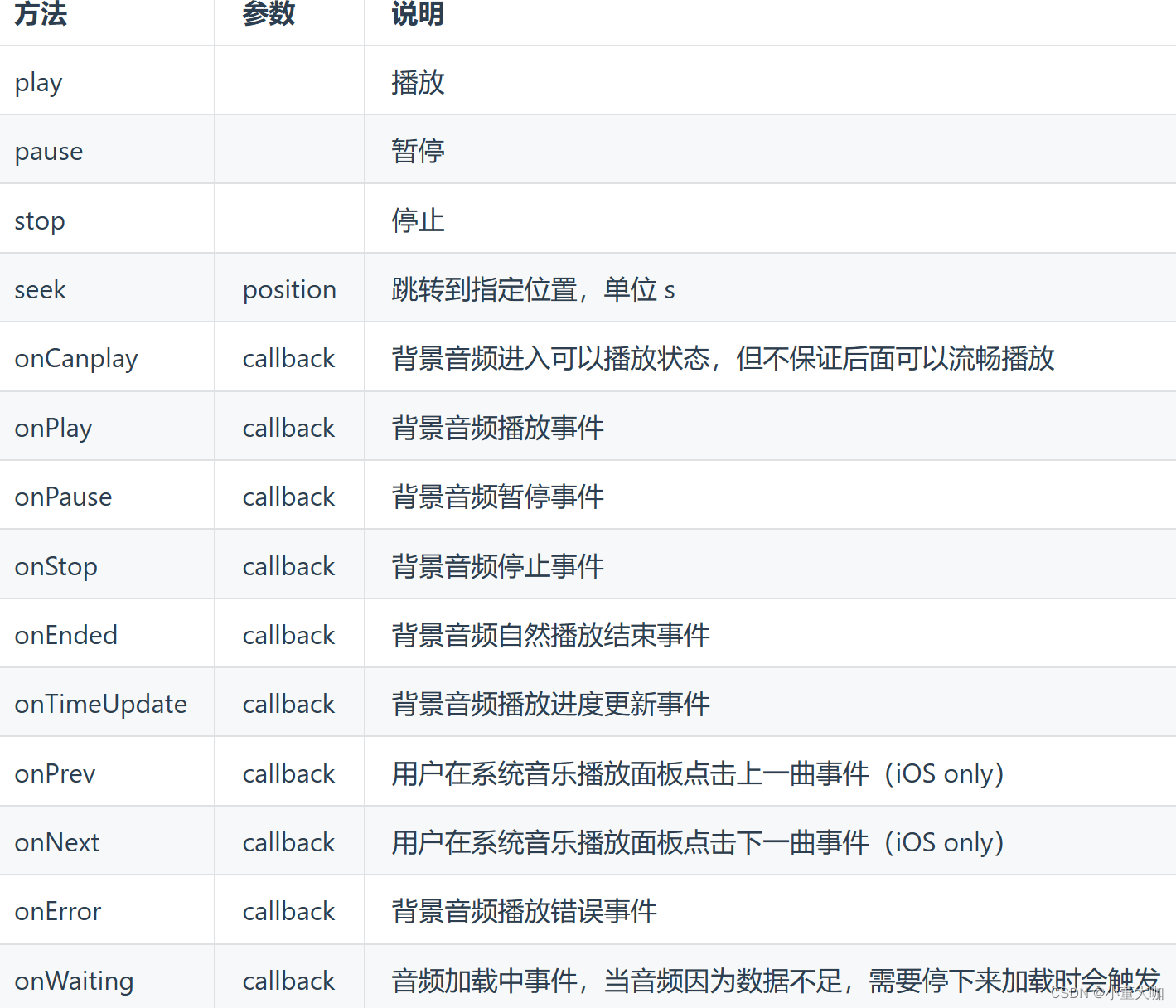 //在顶部声明 const bgAudioManager = uni.getBackgroundAudioManager();bgAudioManager.autoplay = truebgAudioManager.title = 致爱丽丝;bgAudioManager.src = 'https://bjetxgzv.cdn.bspapp.com/VKCEYUGU-hello-uniapp/2cc220e0-c27a-11ea-9dfb-6da8e309e0d8.mp3';bgAudioManager.onPlay(() => {console.log('开始播放')})//onPlay()背景音频播放事件bgAudioManager.onEnded(function(e) {bgAudioManager.src = 'https://bjetxgzv.cdn.bspapp.com/VKCEYUGU-hello-uniapp/2cc220e0-c27a-11ea-9dfb-6da8e309e0d8.mp3'bgAudioManager.play()});//onEnded背景音频自然播放结束事件在里面执行play进行播放bgAudioManager.pause(() => {console.log('暂停播放');});//pause()音频暂停事件