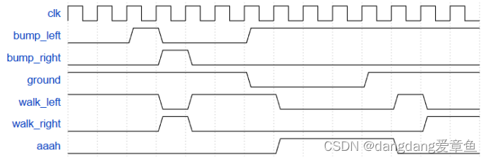 module top_module(input clk,input areset, // Freshly brainwashed Lemmings walk left.input bump_left,input bump_right,input ground,input dig,output walk_left,output walk_right,output aaah,output digging );reg [2:0] state,next_state;parameter left = 0,right = 1,left1 = 2,right1 = 3,dig1 = 4,dig2 = 5;//left1表示从左边跌倒后保持住原来的方向,right1表示从右边跌倒后保持住原来的方向//dig1表示向左边挖掘,dig2表示从右边挖掘//组合逻辑always @(*)begincase(state)left:beginif(ground == 1'b0)next_state = left1;else if(dig)next_state = dig1;else if(bump_left)next_state = right;elsenext_state = left;endright:beginif(ground == 1'b0)next_state = right1;else if(dig)next_state = dig2;else if(bump_right)next_state = left;elsenext_state = right;endleft1:beginif(ground == 1'b0)next_state = left1;elsenext_state = left;endright1:beginif(ground == 1'b0)next_state = right1;elsenext_state = right;enddig1:beginif(ground == 1'b0)next_state = left1;elsenext_state = dig1;enddig2:beginif(ground == 1'b0)next_state = right1;elsenext_state = dig2;endendcaseend//时序逻辑always @(posedge clk,posedge areset)beginif(areset)state <= left;elsestate <= next_state;end//输出逻辑assign walk_right = (state == right);assign walk_left = (state == left);assign aaah = (state == left1 )|(state == right1);assign digging = (state == dig1) | (state == dig2);endmodule