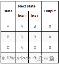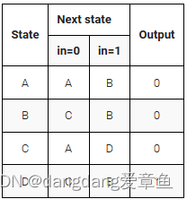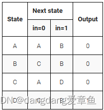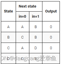 以下是具有一个输入、一个输出和四个状态的 Moore 状态机的状态转换表。实现此状态机。包括将 FSM 重置为状态 A 的同步复位(这与 fsm3 的问题相同,但具有同步复位。(和上题一样,只是把异步复位改成了同步复位)
