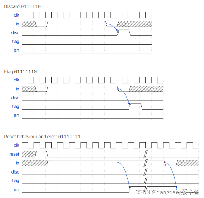 module top_module(input clk,input reset, // Synchronous resetinput in,output disc,output flag,output err);//6 个连续的 1(即 01111110)是一个指示帧边界的“标志”。//先定义状态parameter IDLE = 4'b0000,ONE = 4'b0001,//1TWO = 4'b0010,//11THREE = 4'b0011,//111FOUR = 4'b0100,//1111FIVE = 4'b0101,//11111SIX = 4'b0110,//111111DISC = 4'b0111,//111110FLAG = 4'b1000,//1111110ERROR = 4'b1001;//1111111...reg [3:0]state,next_state;always@(posedge clk)if(reset)state <= IDLE;elsestate <= next_state;always@(*)case(state)IDLE: next_state = in ? ONE : IDLE;ONE: next_state = in ? TWO : IDLE;TWO: next_state = in ? THREE : IDLE;THREE: next_state = in ? FOUR : IDLE;FOUR: next_state = in ? FIVE : IDLE;FIVE: next_state = in ? SIX : DISC;SIX: next_state = in ? ERROR : FLAG;DISC: next_state = in ? ONE : IDLE;FLAG: next_state = in ? ONE : IDLE;ERROR: next_state = in ? ERROR : IDLE;default:state = IDLE;endcaseassign disc = (state == DISC);assign flag = (state == FLAG);assign err = (state == ERROR);endmodule