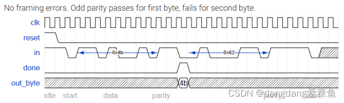 更改 FSM 和数据路径以执行奇偶校验。仅当正确接收字节且其奇偶校验通过时,才断言 done 信号。像串行接收器 FSM,此FSM需要识别起始位,等待所有9(数据和奇偶校验)位,然后验证停止位是否正确。如果停止位未按预期出现,则 FSM 必须等到找到停止位后再尝试接收下一个字节。