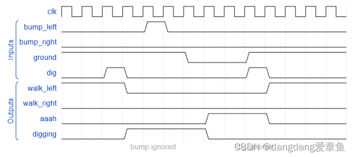 除了走路和跌倒之外,旅鼠有时还可以被告知做一些有用的事情,比如挖掘(当dig=1时开始挖掘)。如果旅鼠目前在地面上行走(地面=1且未掉落),则可以挖掘,并将继续挖掘,直到到达另一侧(地面=0)。在这一点上,由于没有地面,它会掉下来(啊!),然后一旦它再次落地,继续向原来的方向走。与跌倒一样,在挖掘时被撞到没有效果,并且在跌倒或没有地面时被告知要挖洞是被忽略的。