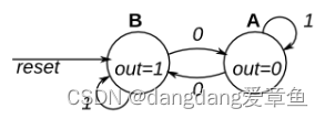 这是一个摩尔状态机,具有两种状态,一种输入,一种输出。实现此状态机。请注意,重置状态为 B。