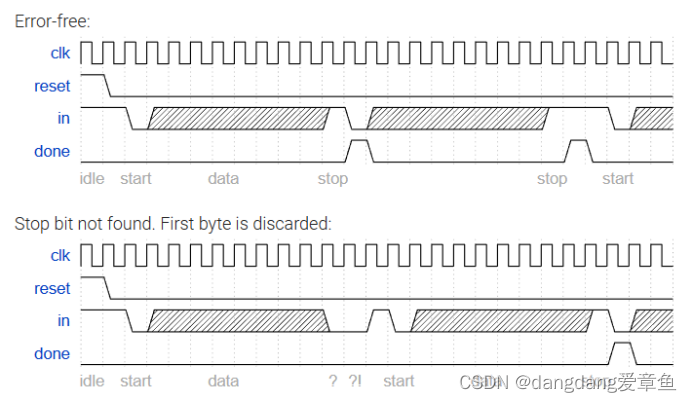 设计一个有限状态机,该状态机将在给定比特流时识别何时正确接收字节。它需要识别起始位,等待所有8个数据位,然后验证停止位是否正确。如果停止位未按预期出现,则 FSM 必须等到找到停止位后再尝试接收下一个字节。