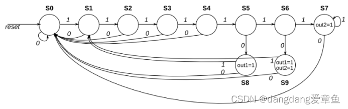 假设此状态机使用独热编码,其中状态 [0] 到 state[9] 分别对应于状态 S0 到 S9。除非另有说明,否则输出为零。