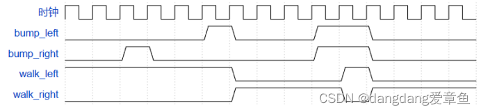 module top_module(input clk,input areset, // Freshly brainwashed Lemmings walk left.input bump_left,input bump_right,output walk_left,output walk_right); // parameter LEFT=0, RIGHT=1;reg state, next_state;always @(*) begin// State transition logicif(state)//状态切换,如果右边有障碍物就向左走,左边有障碍物就向右走next_state <= bump_right ? LEFT : RIGHT;elsenext_state <= bump_left ? RIGHT : LEFT;endalways @(posedge clk, posedge areset) begin// State flip-flops with asynchronous resetif(areset)state <= LEFT;elsestate <= next_state;end// Output logicassign walk_left = (state == LEFT);assign walk_right = (state == RIGHT);endmodule