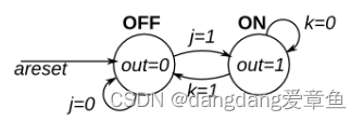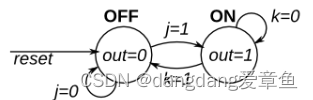 实现具有两个状态、两个输入和一个输出的 Moore 状态机,用于模拟此行为。