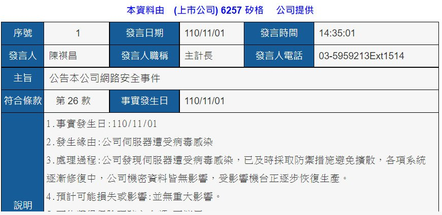 对外公告资安事件 在11月1日发布于台湾证券交易所重大讯息