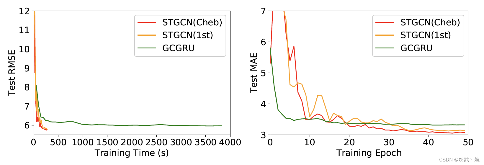 In order to further investigate the performance of compared deep learning models, we plot the RMSE and MAE of the test set of PeMSD7(M) during the training process, see Figure 5. Those figures also suggest that our model can achieve much faster training procedure and easier convergences. Thanks to the special designs in ST-Conv blocks, our model has superior performances in balancing time consumption and parameter settings. Specifically, the number of parameters in STGCN ( 4.54 × 1 0 5 4.54×10^5 4.54×105) only accounts for around two third of GCGRU, and saving over 95 % 95\% 95% parameters compared to FC-LSTM.