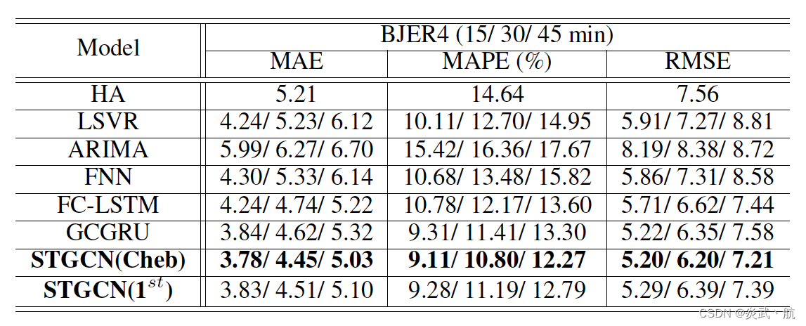STGCN模型 对于BJER4和PeMSD7(M/L),ST-Conv块的三层通道分别为 64 64 64、 16 16 16、 64 64 64。模型 STGCN(Cheb) 采用Chebyshev多项式近似,图卷积核大小 K K K 和时间卷积核大小 K t K_t Kt 均设为 3 3 3 ,而模型 STGCN( 1 s t \bf1^{st} 1st) 采用 1 1 1 阶近似, K K K 设为 1 1 1 。我们通过使用 RMSprop最小化均方误差 来训练我们的模型,共 50 50 50 个epoch,每个批次大小为 50 50 50 。初始学习率为 1 0 − 3 10^{-3} 10−3 ,每 5 5 5 个epoch衰减率为 0.7 0.7 0.7 。