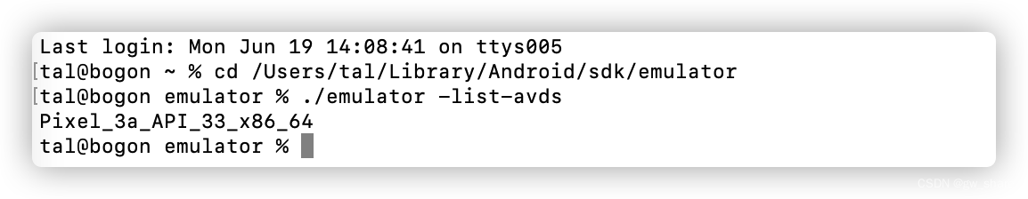 mac: ./emulator -avd Pixel_3a_API_33_x86_64