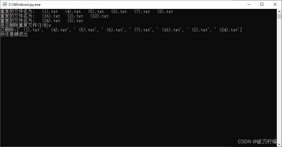 def Get_MD5_Checksum(File_Path):MD5 = hashlib.md5() #获取MD5算法对象with open(File_Path, 'rb') as file:for chunk in iter(lambda: file.read(4096), b''):MD5.update(chunk)return MD5.hexdigest()if __name__ == '__main__':checksum = [] #哈希值缓存emptyDict = {} #所有文件及哈希值Duplicate_File = [] #重复文件file = [f for f in os.listdir() if os.path.isfile(f)] #查找所有文件for Count_i in range(len(file)):checksum.append(Get_MD5_Checksum(file[Count_i])) #计算哈希值emptyDict[file[Count_i]] = checksum[Count_i] #将每个文件名与哈希值匹配Counter_value = Counter(checksum).most_common() #计算重复哈希值数for Count_j in range(len(Counter_value)):Counter_File = Counter_value[Count_j][1] #获取单哈希值的重复文件数if int(Counter_File) > 1: #对重复文件进行处理print("重复的文件名为: ",end="")for key, value in emptyDict.items():if Counter_value[Count_j][0] == value: #字典通过值找键print(key+" ",end="")Counter_File -= 1if(Counter_File): #重复文件只保留一个Duplicate_File.append(key) #将重复的文件名添加到列表print("")if(Counter_value[0][1] > 1): #判断是否有重复文件Input = input("是否删除重复文件(Y/N)")if (Input == 'y') | (Input == 'Y'): #根据用户输入来删除文件print("已删除:",end="")print(Duplicate_File)for Count_k in range(len(Duplicate_File)): #删除重复文件列表中文件os.remove(Duplicate_File[Count_k])else:print("未找到重复文件")input("按任意键退出")