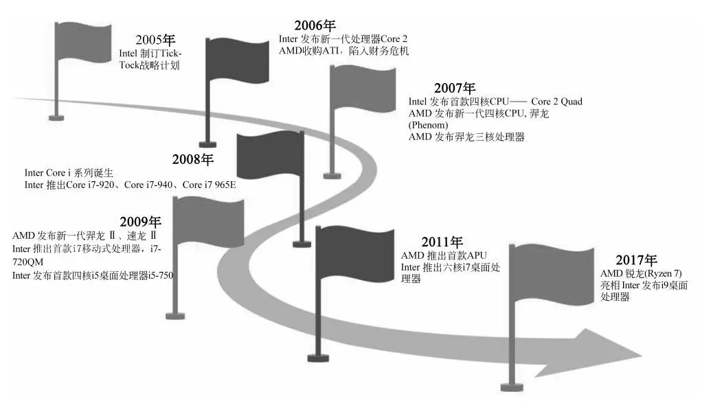 2006年,英特尔公司启用全新的名称——酷睿(Core)并发布了酷睿架构处理器,首次针对移动、台式机和服务器这3个平台采用了相同的核心架构模型,这代表酷睿系列微处理器时代的来临,其发展过程如图2-13所示。