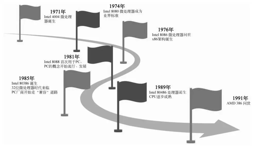 CPU的发展史简单来说就是英特尔(Intel)公司和高级微型仪器公司(AMD)的发展历史。谈起这两个公司,它们的渊源可以从了解仙童半导体公司开始。仙童半导体公司因发明集成电路闻名,公司营业额不断攀升,但由于仙童公司所盈利润不断被挪用于支持母公司的盈利水平,因此人才纷纷离开仙童公司,继而掀起了半导体工业领域的创业狂潮,大名鼎鼎的英特尔公司和AMD公司也是由从仙童“叛逃”出来的员工创立的。