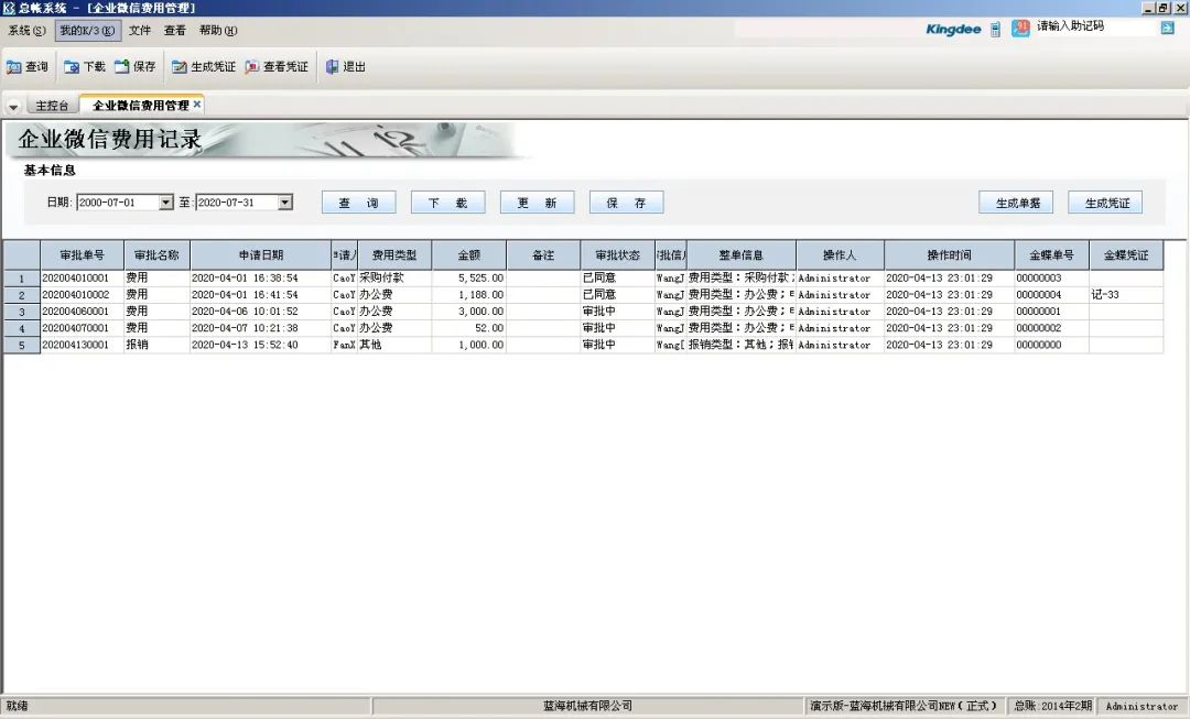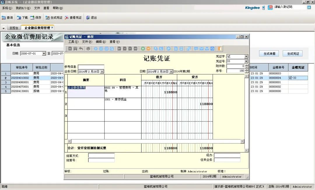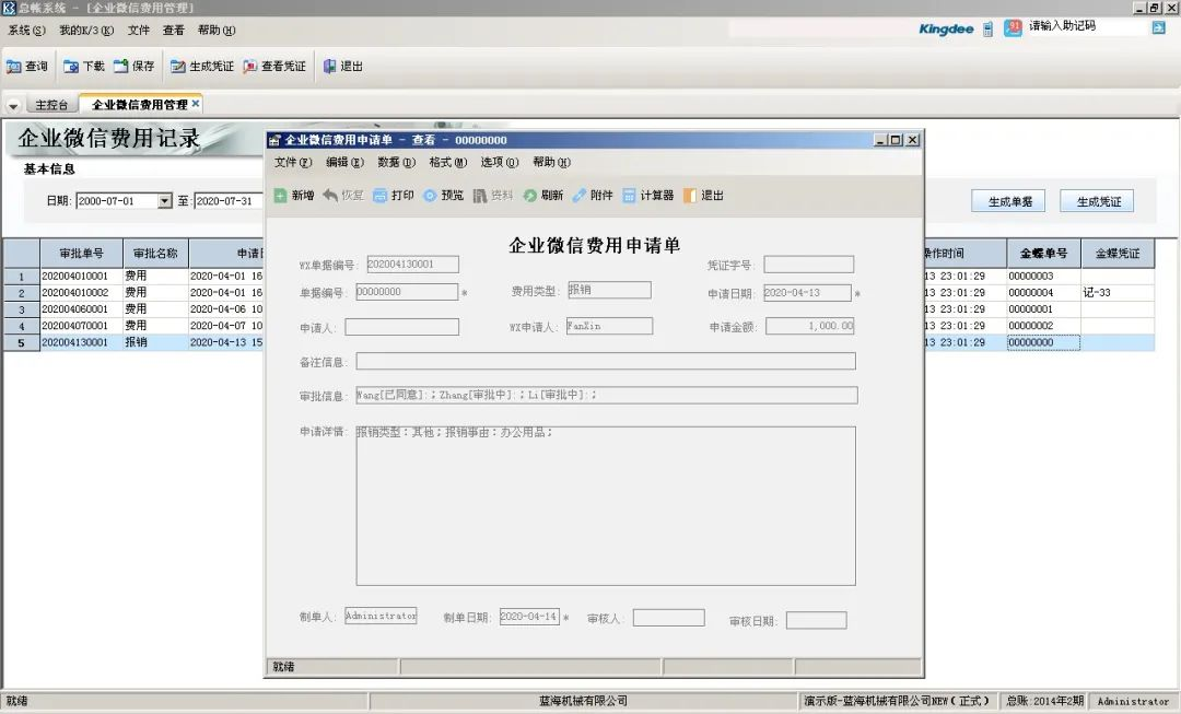 目前,很多企业都接入了企业微信,除了与客户、供应商、员工的信息沟通外,也进行一些各类单据的审批等工作,可以说非常方便。但同时也会给企业带来一些数据重复处理问题,比如在企业微信中审批的费用,如果需要在金蝶中进行凭证处理,就要再次手工处理,不够方便。