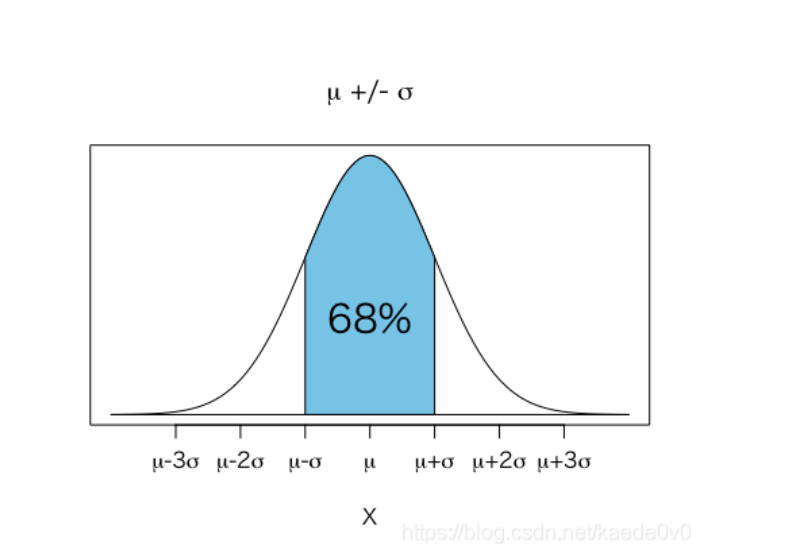 在中轴x=μ的第一个标准差(x-σ,x+σ),如下图,两者所围的图像概率为68%;