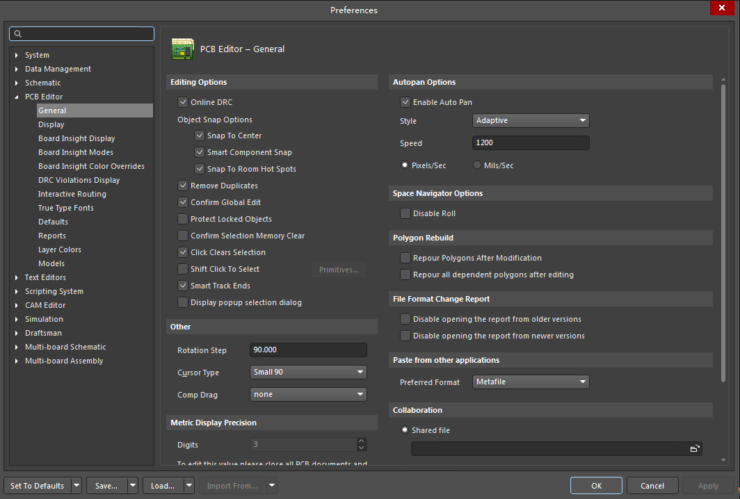 “首选项”对话框的“ PCB编辑器–常规”页面提供了许多与PCB工作区中PCB编辑器的常规设置有关的控件。