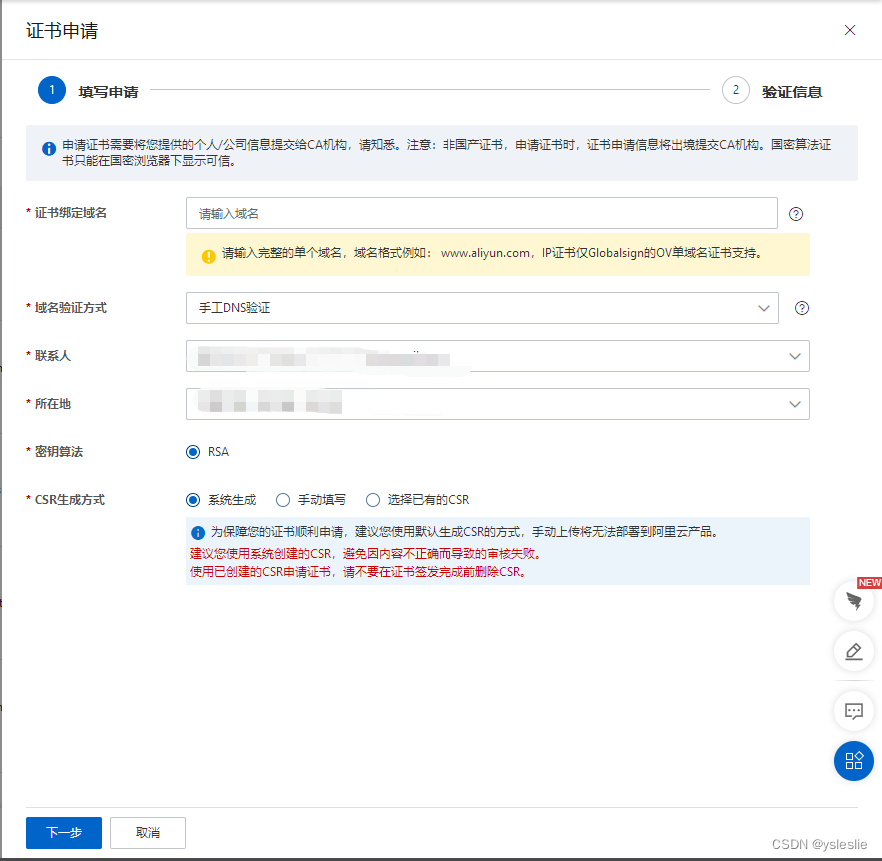 - 域名验证方式:如果你的域名是在当前的阿里云账号下申请的,就选“自动DNS验证”,如果不在当前账号下,就选“手工DNS验证”
