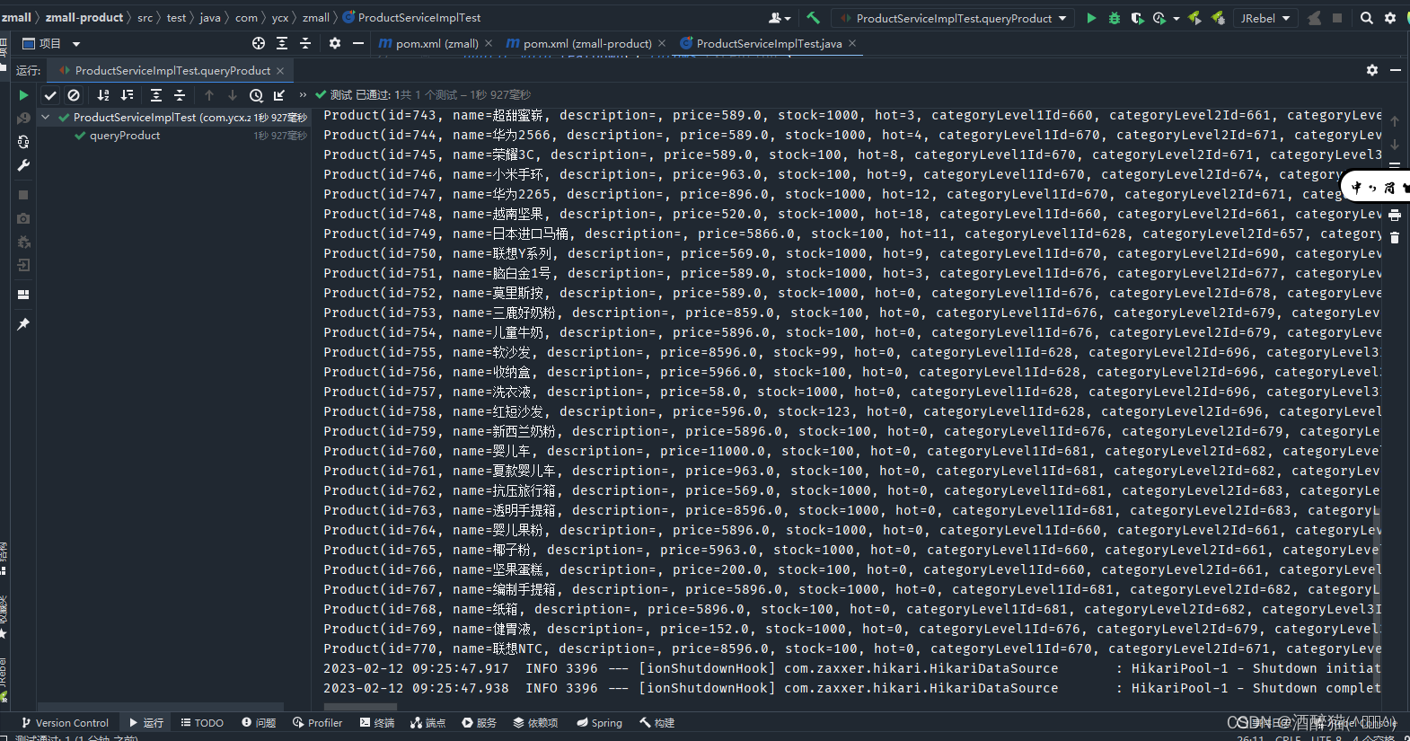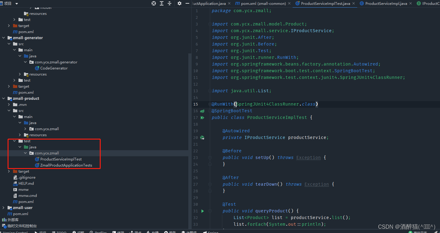 public class ProductServiceImplTest {@Autowiredprivate IProductService productService;@Beforepublic void setUp() throws Exception {}@Afterpublic void tearDown() throws Exception {}@Testpublic void queryProduct() {List list = productService.list();list.forEach(System.out::println);}