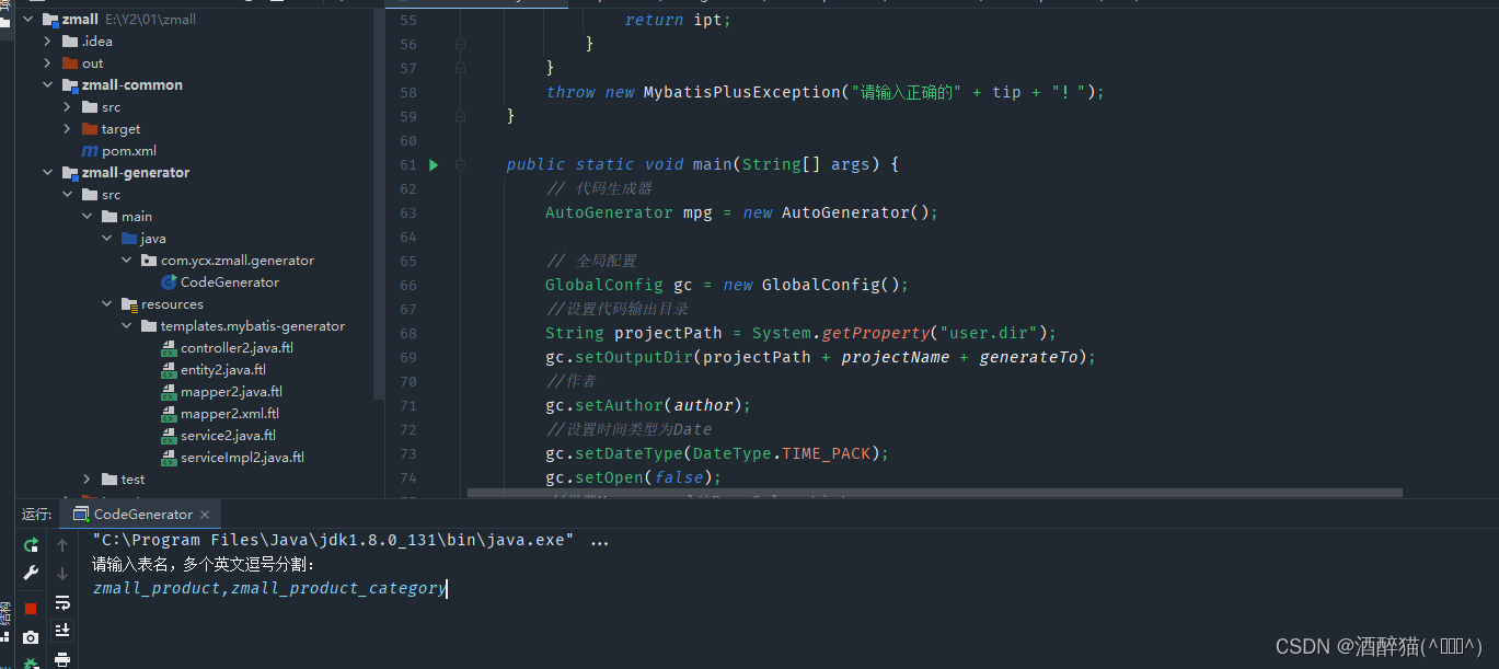 4.在src/main/java下创建包com.ycx.zmall,并导入generator下的CodeGenerator类用于代码生成