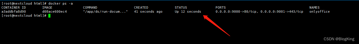 systemctl enable dockerdocker pull onlyoffice/documentserver:7.0docker imagesdocker run -d --restart=always --name onlyoffice -p 9000:80 -p 9001:443 -v /app/onlyoffice/logs:/var/log/onlyoffice -v /app/onlyoffice/data:/var/www/onlyoffice/data -it d08ace600ec4docker ps -a