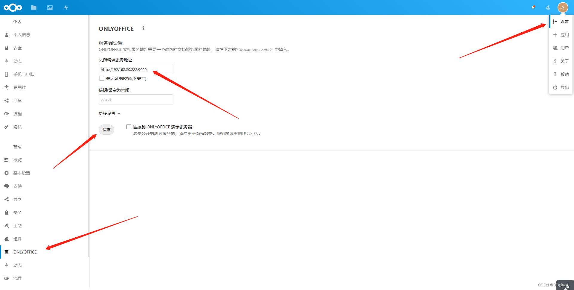 启用后 需进行相应配置 继续输入Document Service 服务器IP 和 端口