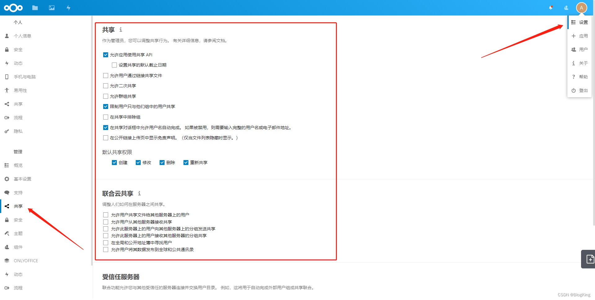 - Nextcloud 可以透过OpenID或者LDAP来实现用户群组或组群间的读写权限调整,以达到分享文件的目的和利用第三方平台的OAuth2进行接入;