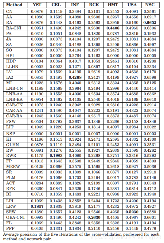 由于网络的形成是一个复杂的过程,受到很多因素的影响,因此不可能设计一个方法比其他的方法在任意的网络上效果都好。下图在Víctor Martínez等人在YST,CEL等数据集上对这些方法进行了实验,可以发现局部法和准局部法效果较好。