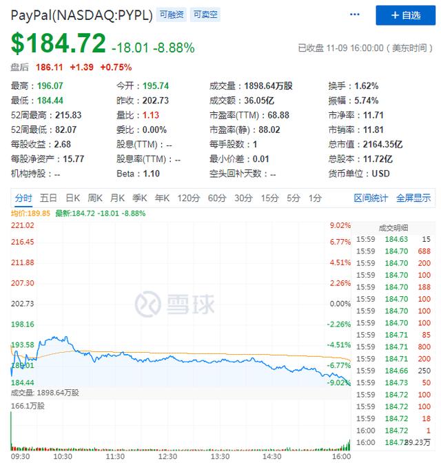 在全球资本市场上,数字支付领域已经诞生一些头部巨头跟众多独角兽。尤其是中美在支付领域已走在前列,Paypal跟蚂蚁集团在资本市场上都获得较高的估值。截至目前,Paypal盘后股价为186.11美元,市值为2164.35亿美元。