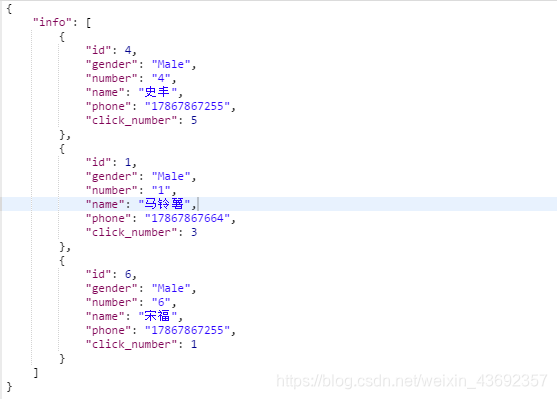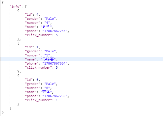 def add_click(self, request, *args, **kwargs):'''更新点击用户的次数'''try:pk = int(request.data['id'])user_obj = models.Test.objects.get(id=pk)record_click(pk)return Response({'info': '%s:浏览了一次' % user_obj.name})except:return Response({'info': 'error'})def get_list(self, request, *args, **kwargs):'''获取点击用户的前几条数据'''try:get_res= get_top_n_users(3)res=[]print(get_res)for dic in get_res:for k,v in dic.items():data=self.serializer_class(v).datadata['click_number']=kres.append(data)return Response({'info': res})except:return Response({'info': []})