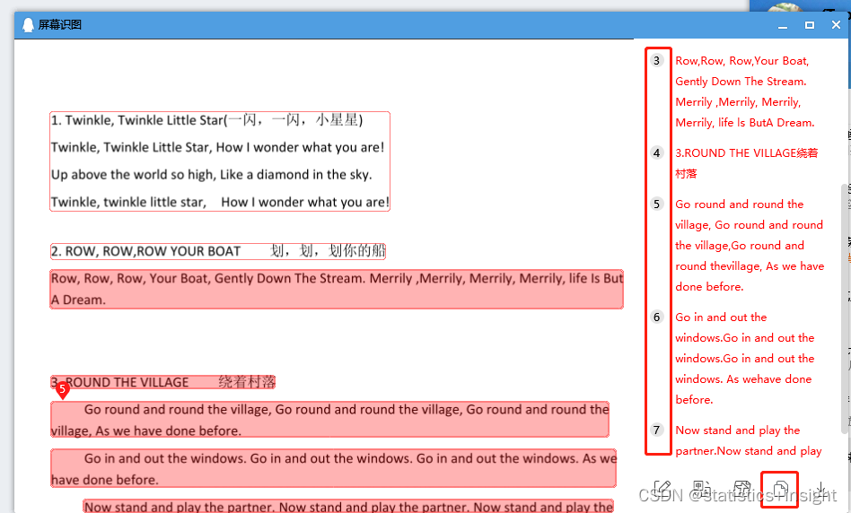 2、 右侧为屏幕识图已提取内容,按住"Crtl键"选中多条文字,点下右下角复制,将文字粘贴至word文档中。