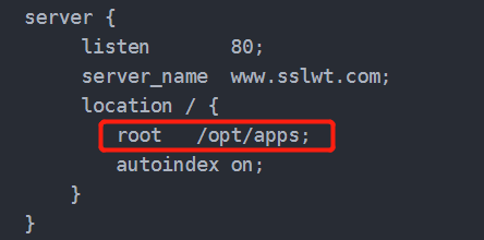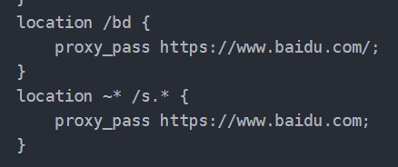 gzip on;server {listen 80;server_name www.nuclwt.com;location / {root html;index index.html index.html;}location /bd {proxy_pass https://www.baidu.com/;}location ~* /s.* {proxy_pass https://www.baidu.com;}}server {listen 80;server_name www.sslwt.com;location / {root /opt/apps;autoindex on;}}