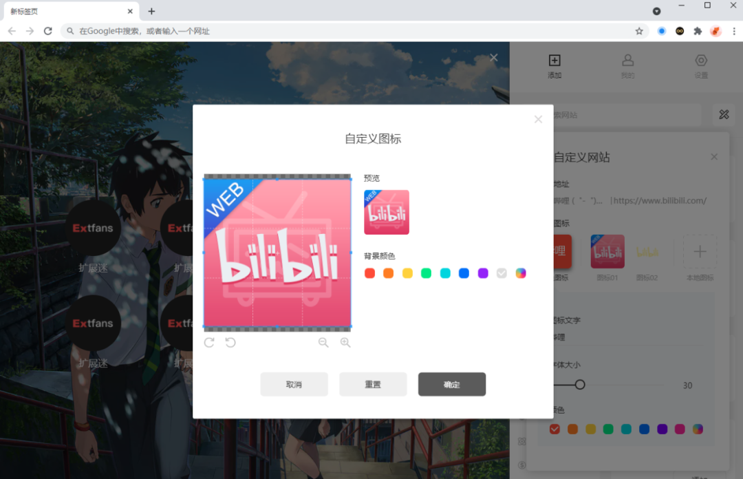 在添加自定义网站窗口中输入网址后,便会自动显示当前URL的默认图标。